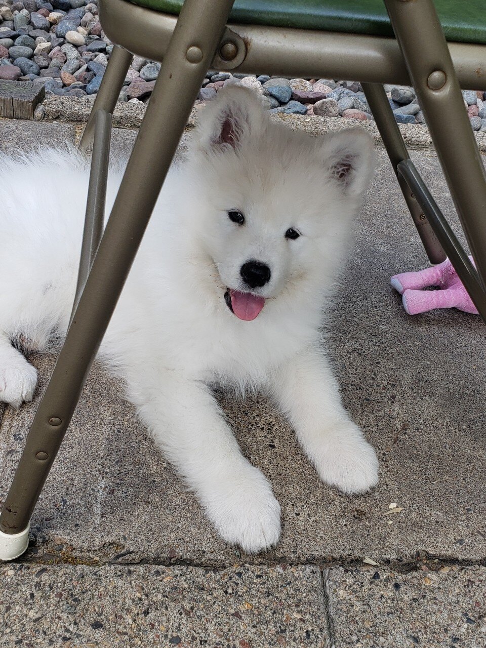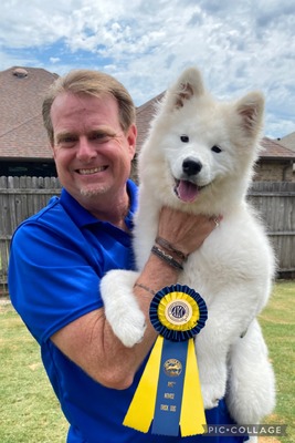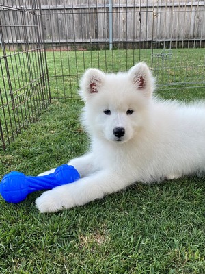 Welcome to the XnO Family Jett! Jett came to us from Elfie Shea and Elfenbein Samoyeds in May of 2025. She has already proven to be a loving member in our pack. We look forward to getting her started in her show career in Fall of 2025! She is a beautiful girl, full of energy and very smart. She earned the AKC Novice Trick Dog title at 4 months old and is currently learning conformation and obedience/rally.
