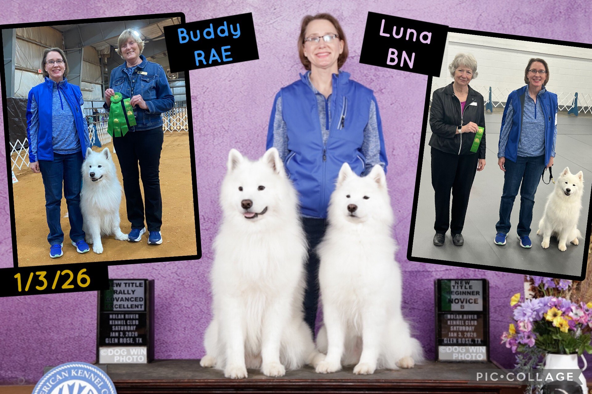 Buddy and Luna both started 2026 off with a bang earning titles in Glen Rose, TX. Buddy earned his Rally Andvanced Excellent (RAE) title with his 10th Double Q on Saturday. Not to be outdone, Luna finished her Beginner Novice (BN) title in Obedience on the same day.
